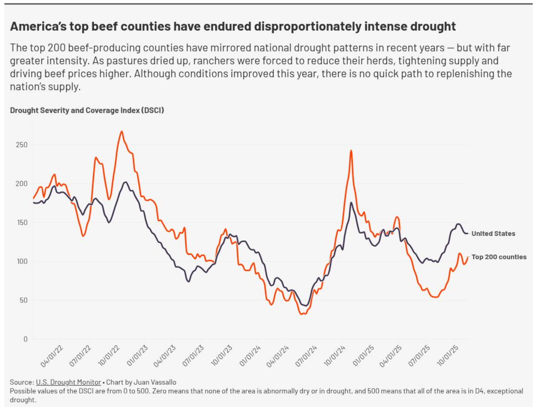 But for the top 200 cattle-producing counties — together representing roughly a quarter of the national herd — the drought index peaked at 267.5 in the same period, far higher than the national average.