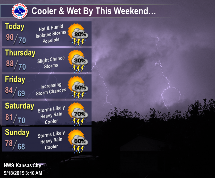 Another hot and muggy day today before the gradual cool down heading into the weekend. While temperatures decrease, rain and storm chances will increase with highs in the upper 70s and heavy rain possible by Sunday. This afternoon and evening could see few isolated to scattered storms, primarily across central and northern Missouri, but better chances for storms and heavy rain will arrive Friday and continue through Sunday. Here’s the 7-day forecast from the National Weather Service: